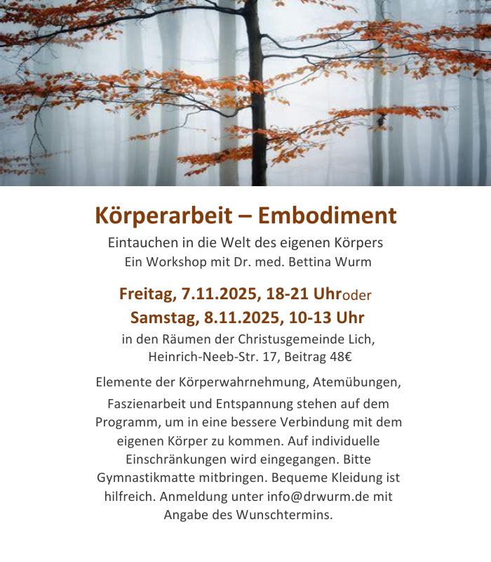Mit meiner langjährigen Erfahrung als Ärztin, Körpertherapeutin und Referentin für Körperarbeit begleite ich dich dabei, Kraft und Beweglichkeit zu fördern und zugleich innere Ruhe und Gelassenheit zu finden.